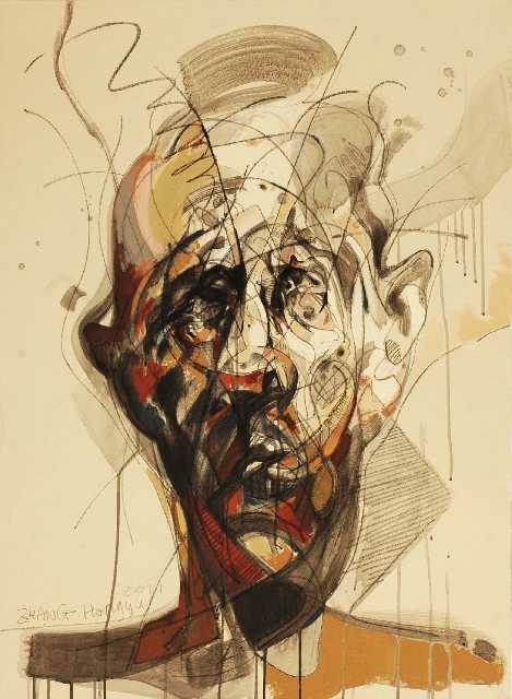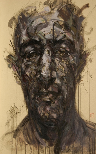Présentation : Essentiellement portraitiste d'un même visage émacié, vue de face, le nez proéminent, capté par des coups de pinceau nerveux à l'acrylique noir ; sur cette face, il déroule une pelote de traits noirs et parsème des gouttelettes comme une transgression par regret, N° 36, (2012).